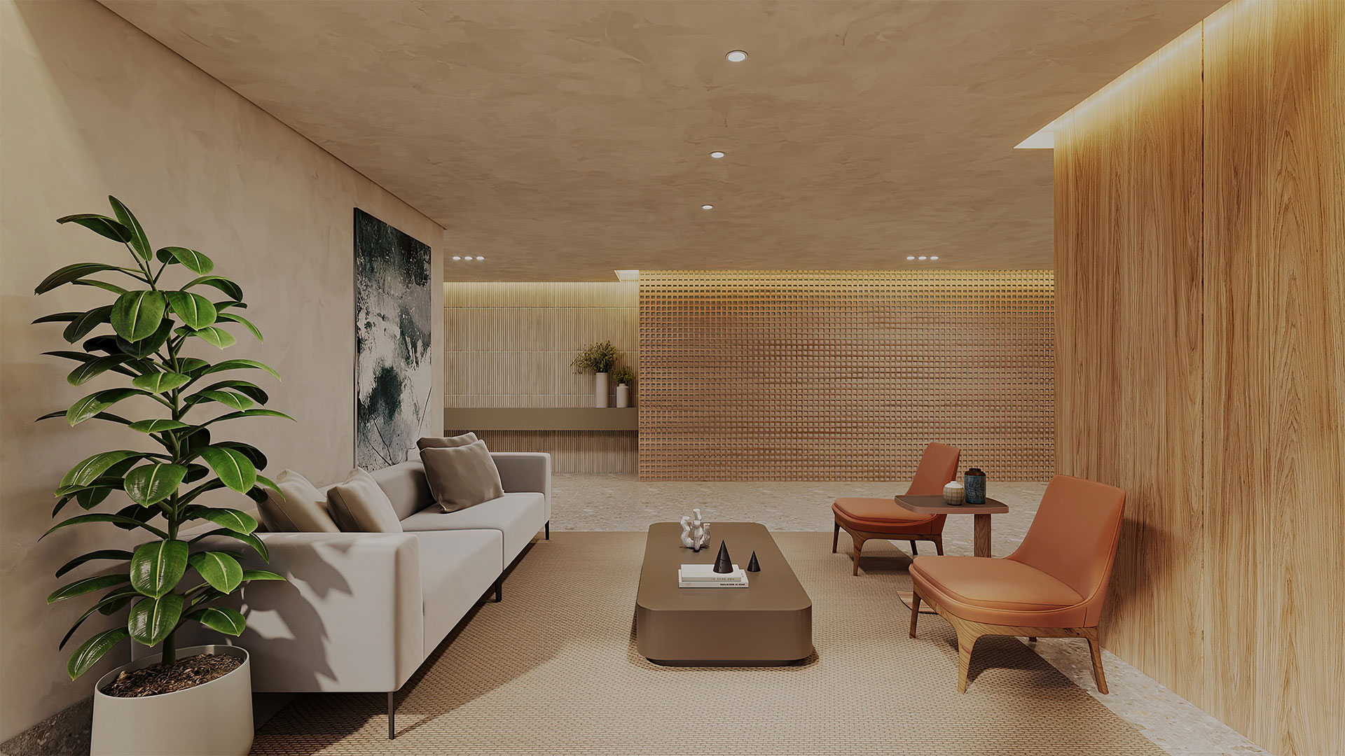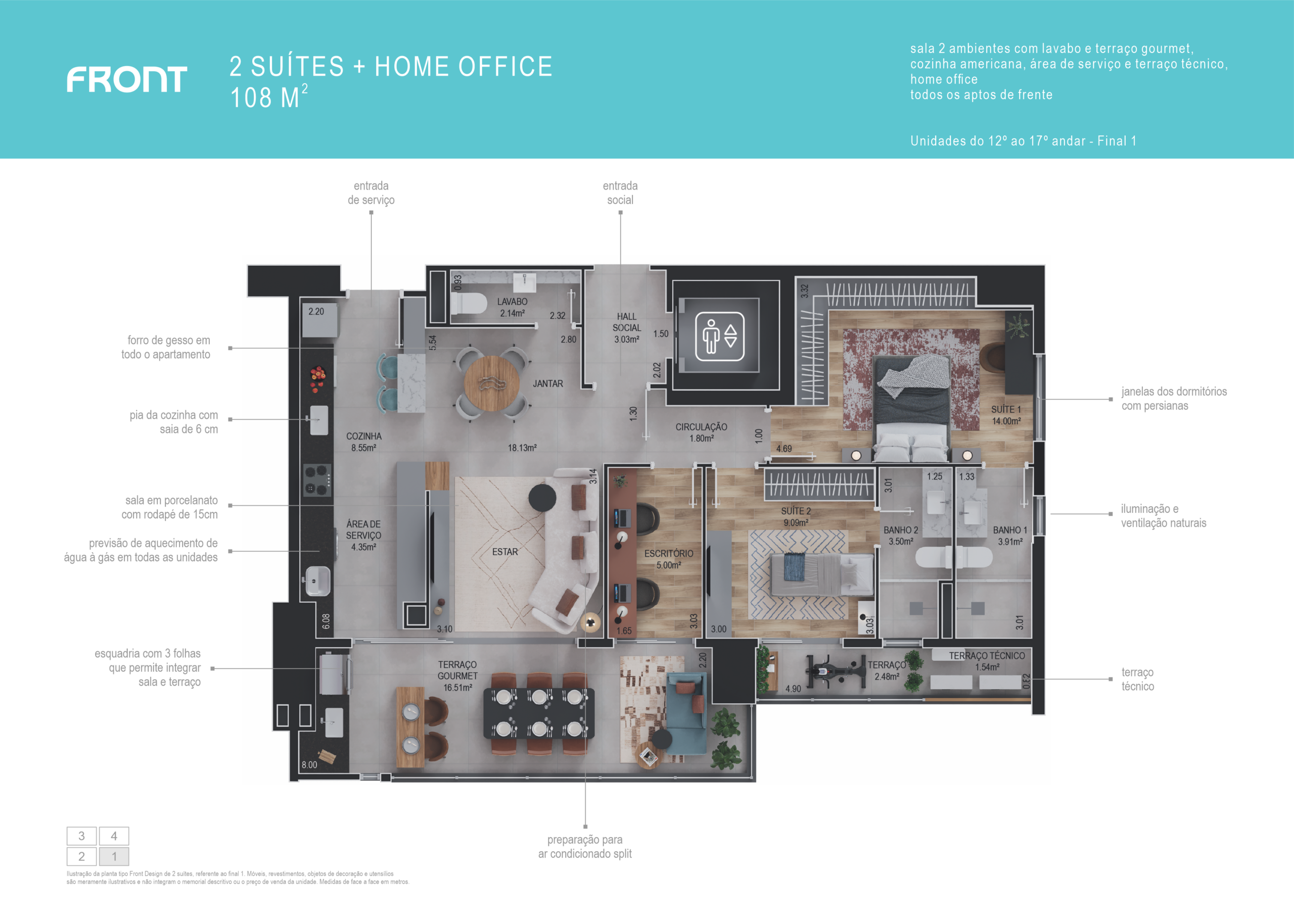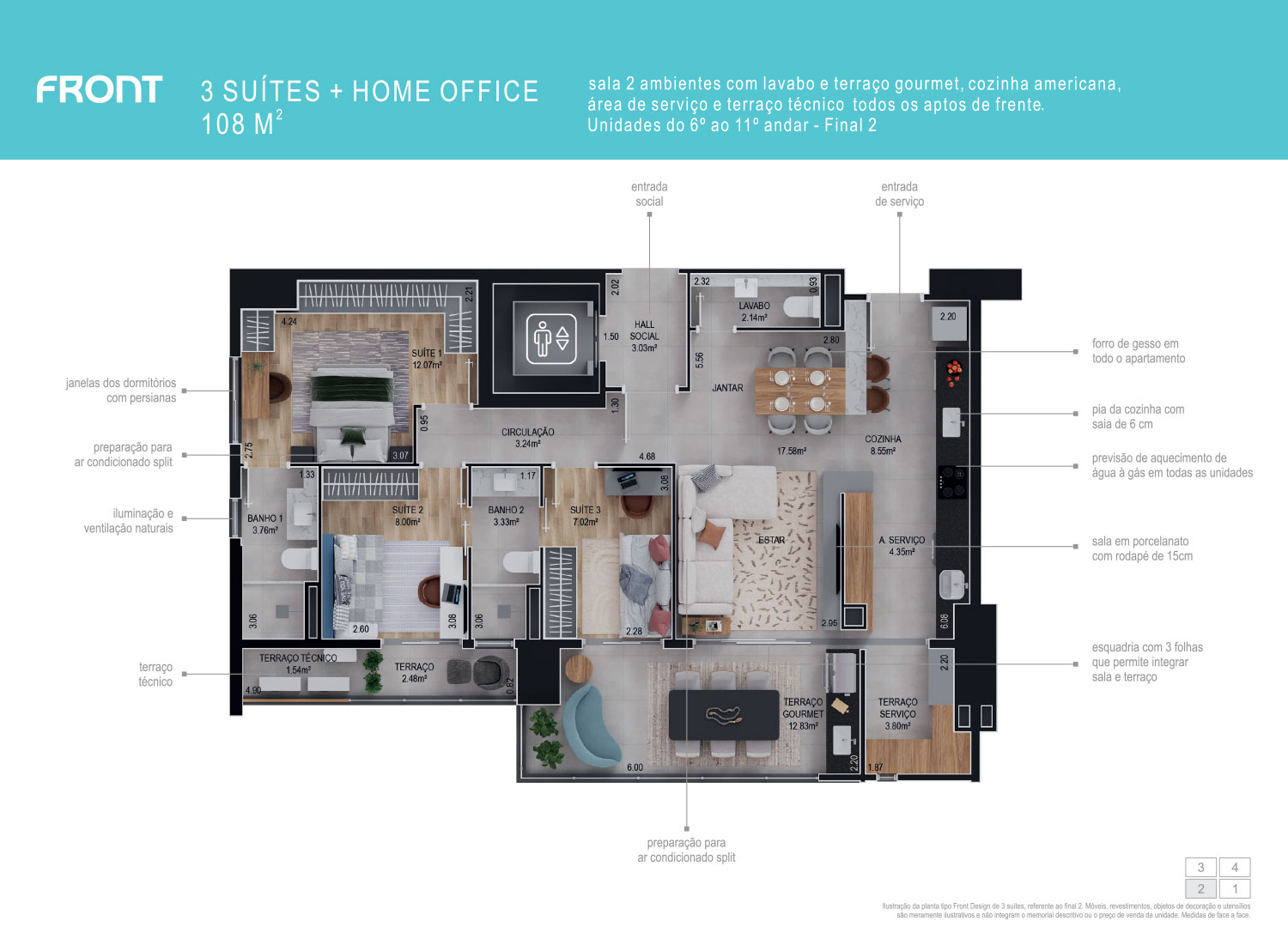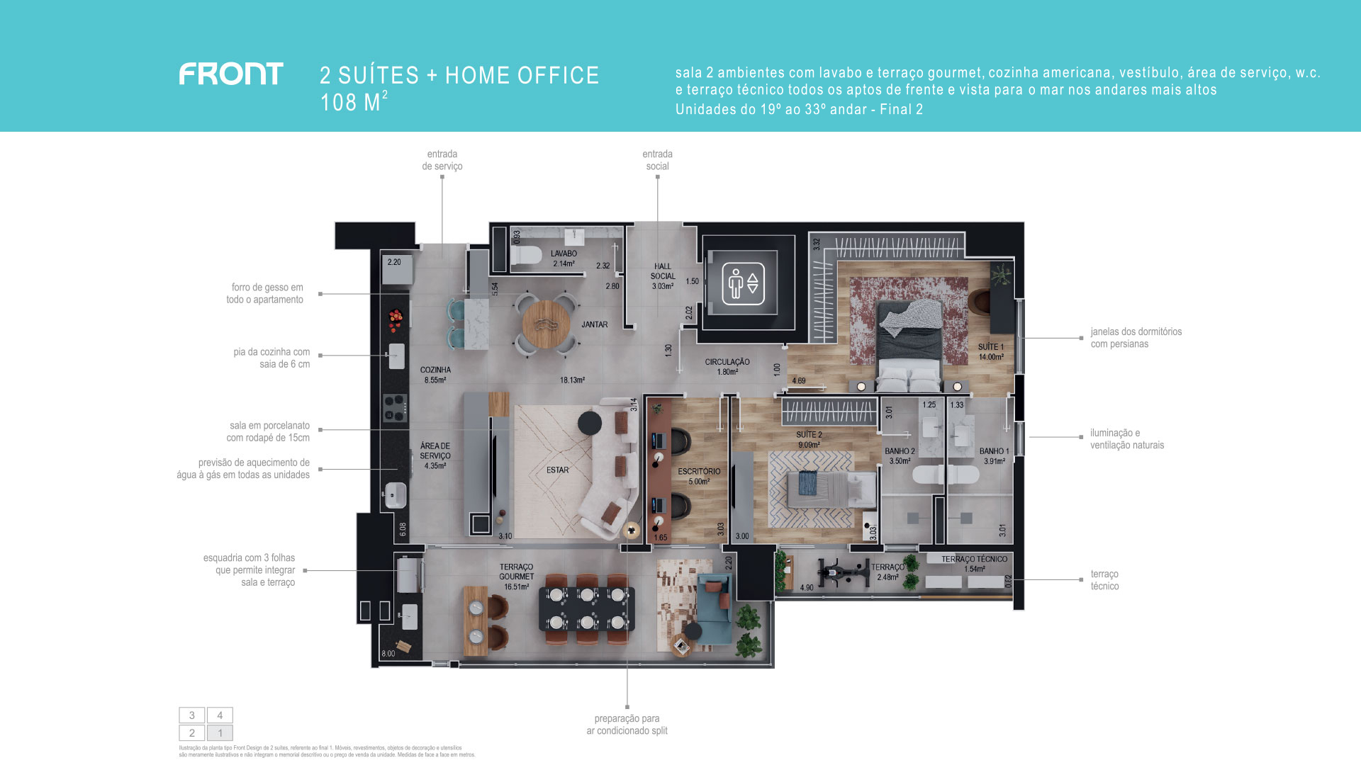 2 suítes + home office, sala com lavabo e terraço gourmet, cozinha americana, área de serviço e terraço técnico. Todos os apartamentos de frente.