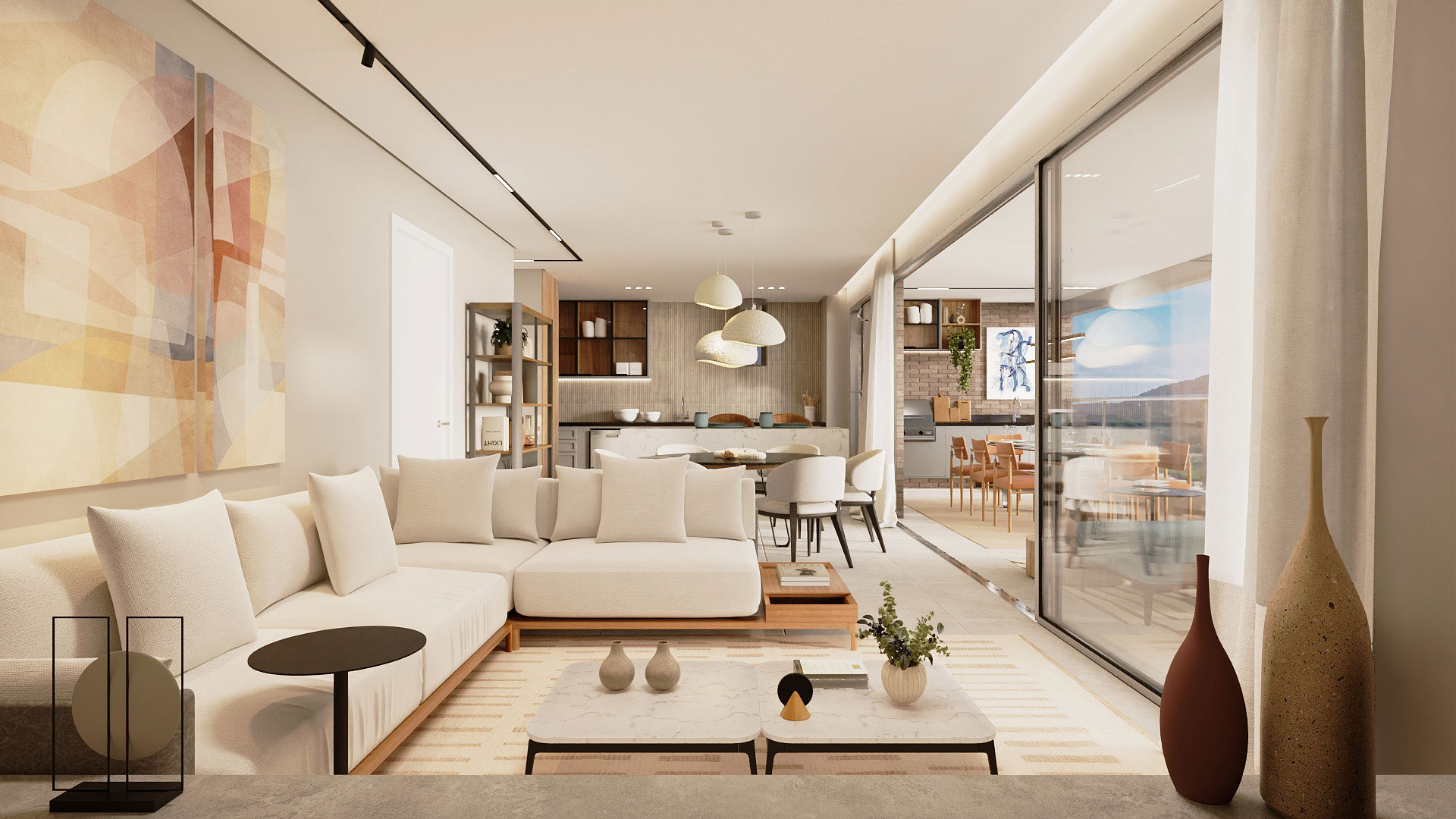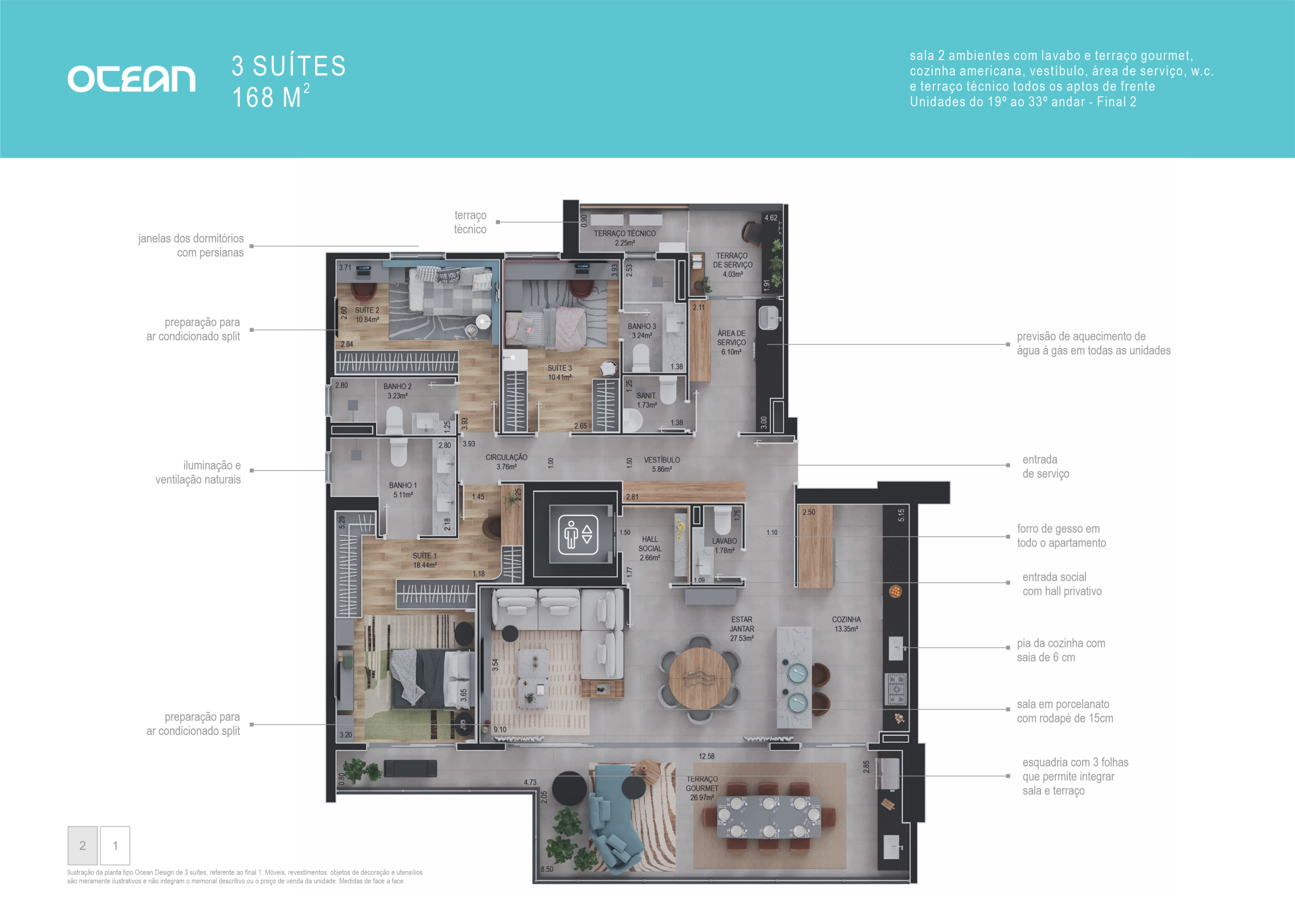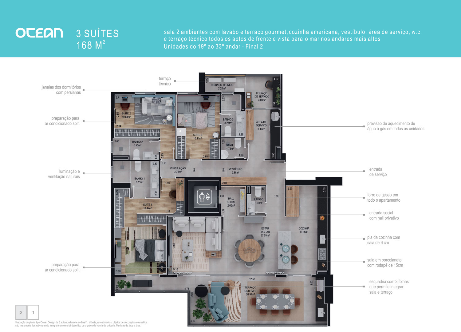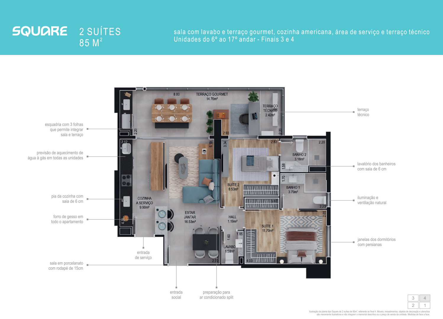 2 suítes, sala com lavabo e terraço gourmet, cozinha americana, área de serviço e terraço técnico.