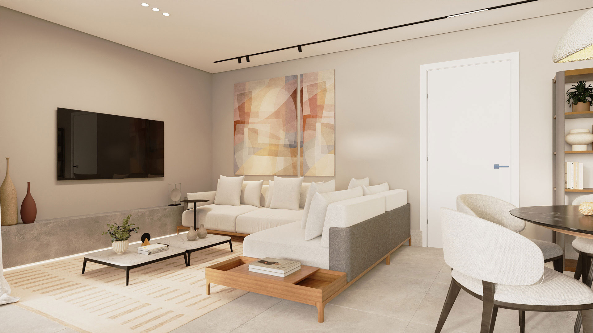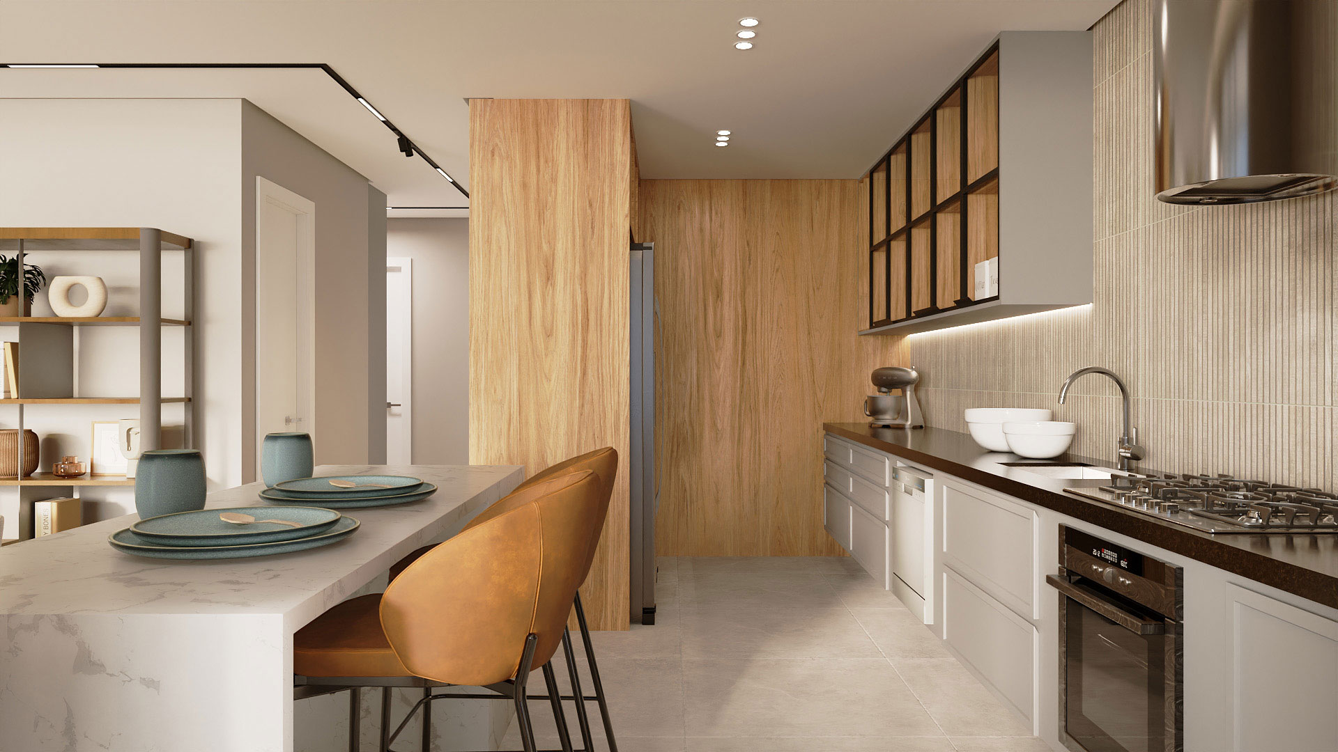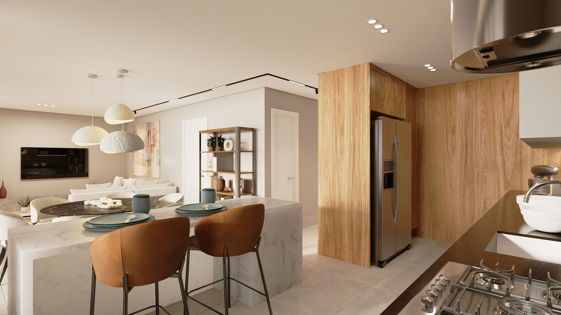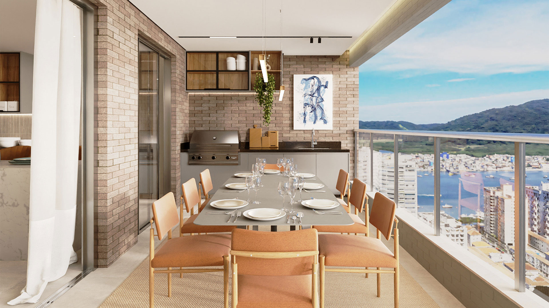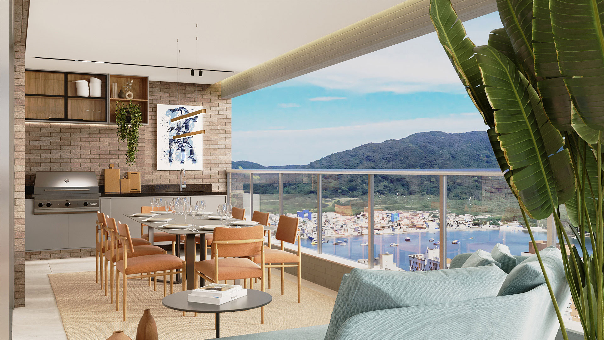 2 suítes, sala com lavabo e terraço gourmet, cozinha americana, área de serviço e terraço técnico.