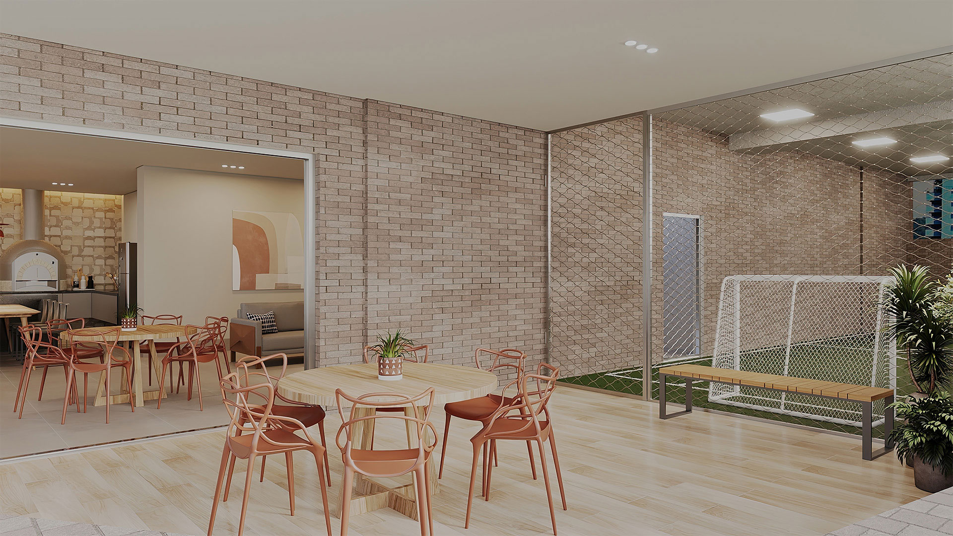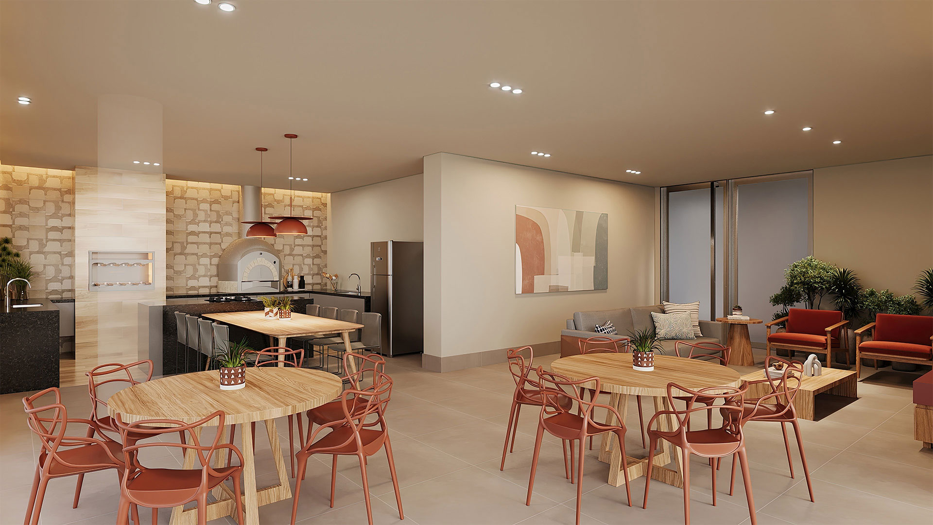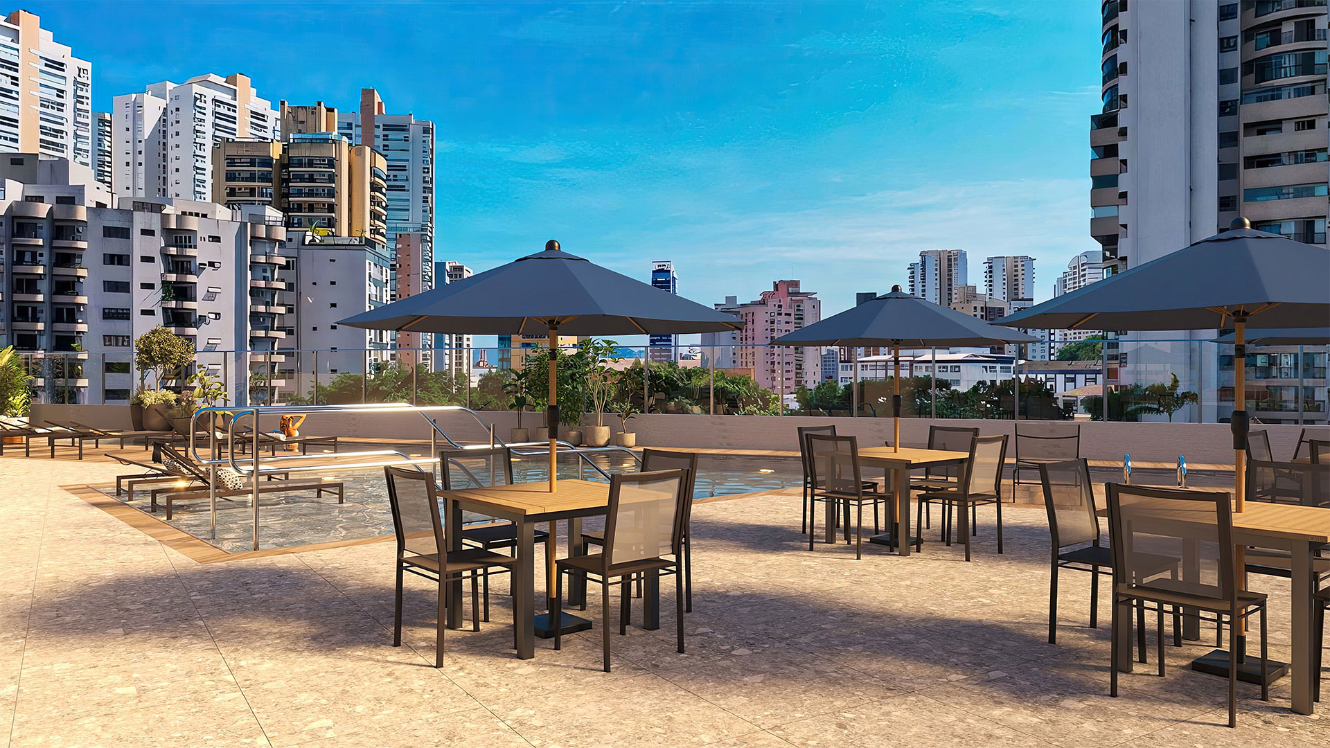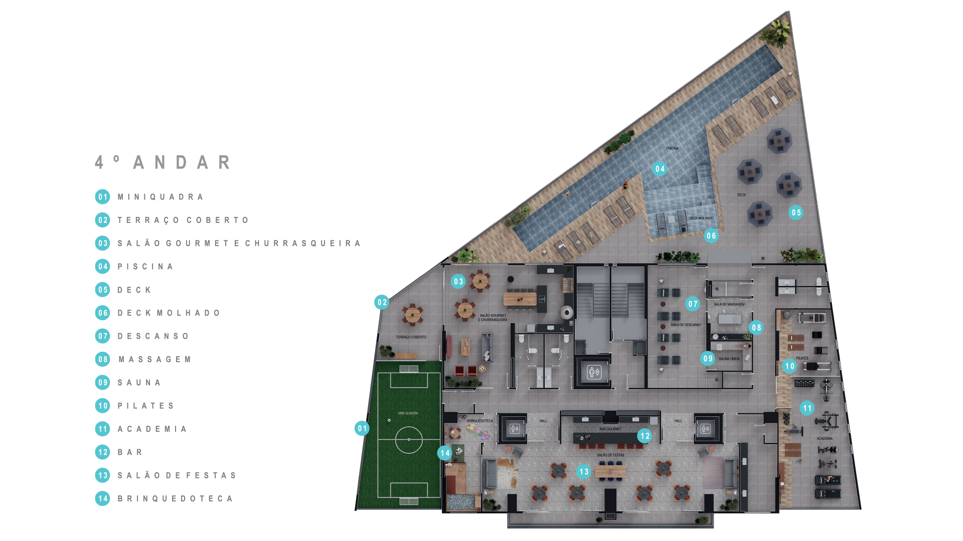 Salão de festas com bar, cozinha e brinquedoteca; salão gourmet com churrasqueira, forno de pizza e terraço coberto; mini quadra; espaço fitness; pilates; sauna com sala de massagem e descanso; piscina com deck molhado e solarium.