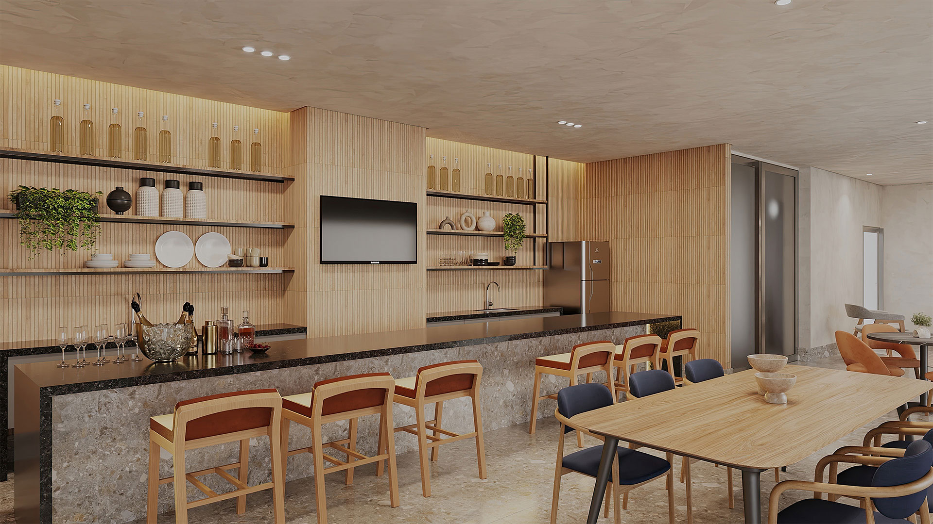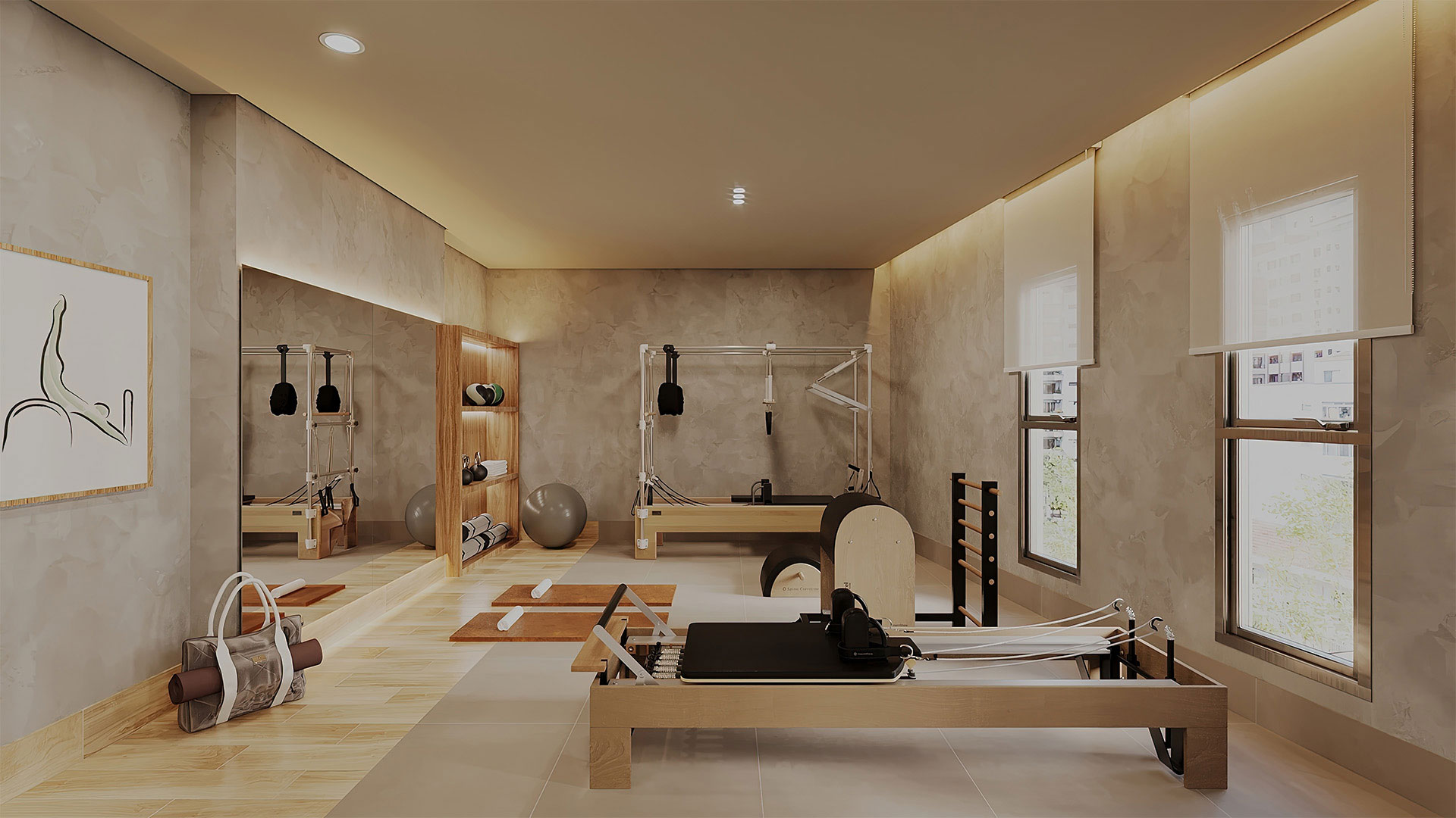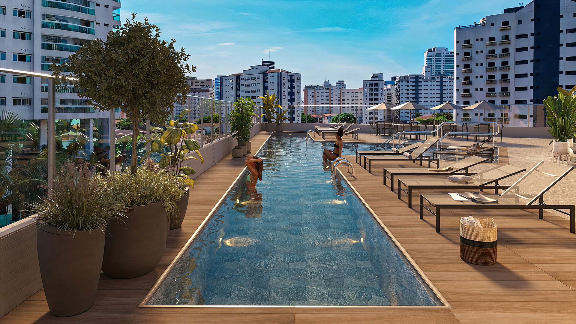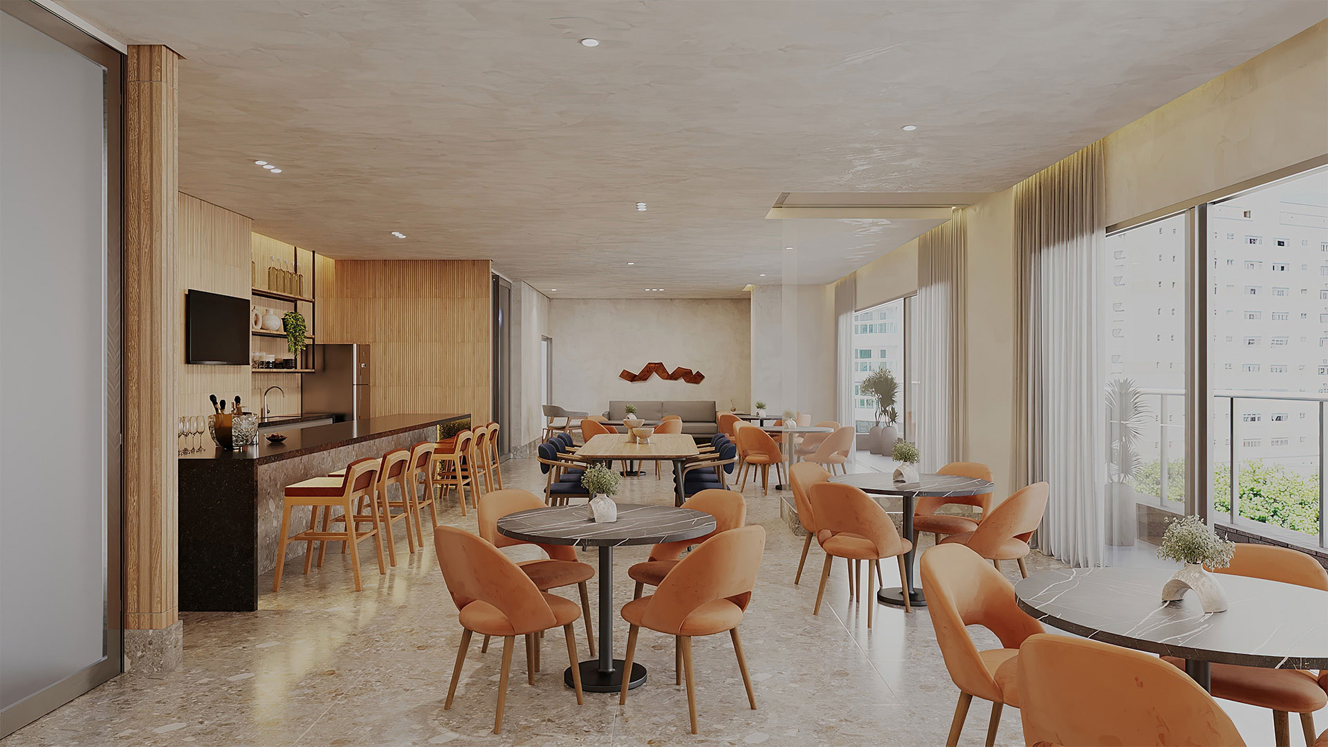 Salão de festas com bar, cozinha e brinquedoteca; salão gourmet com churrasqueira, forno de pizza e terraço coberto; mini quadra; espaço fitness; pilates; sauna com sala de massagem e descanso; piscina com deck molhado e solarium.
