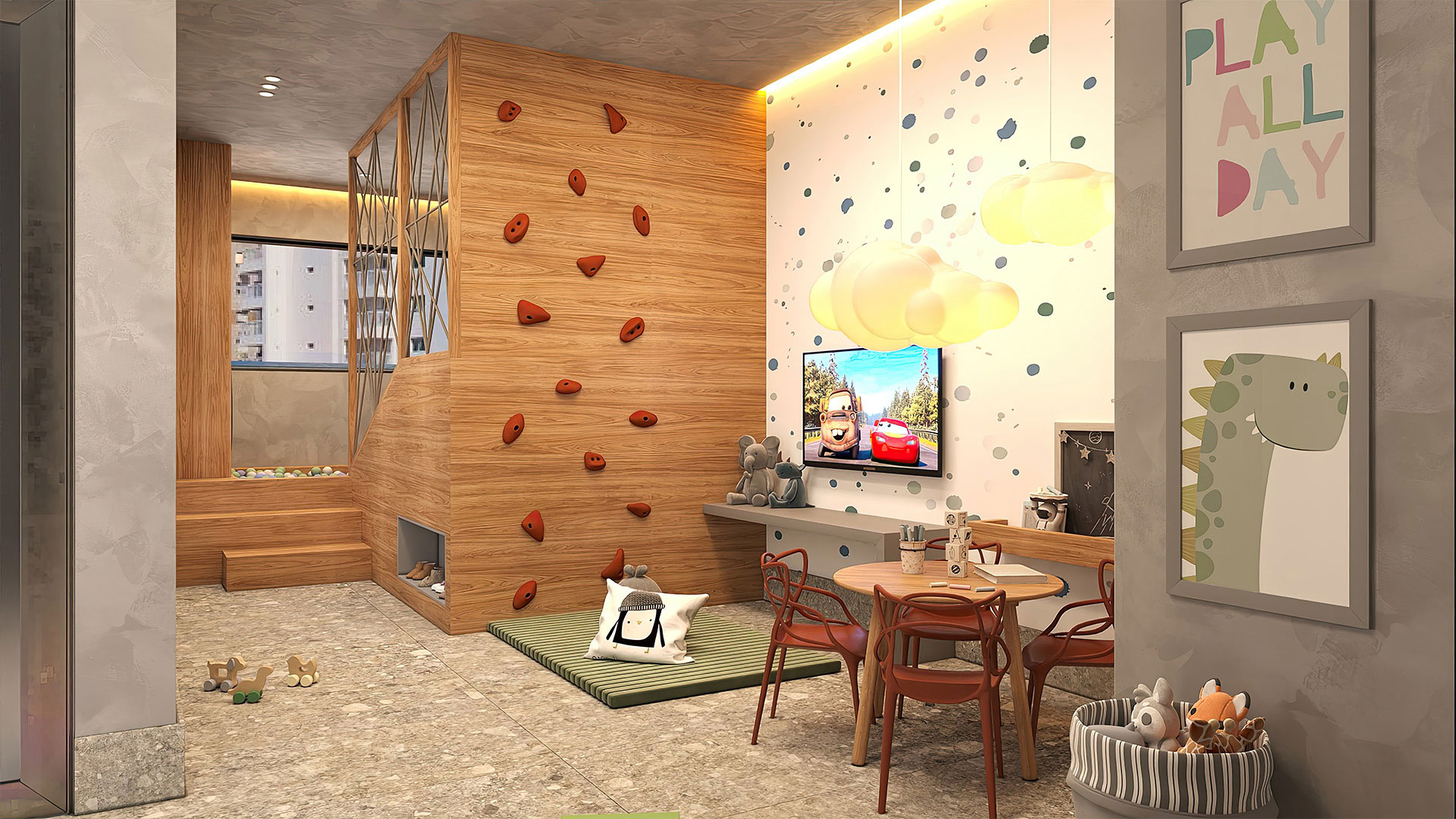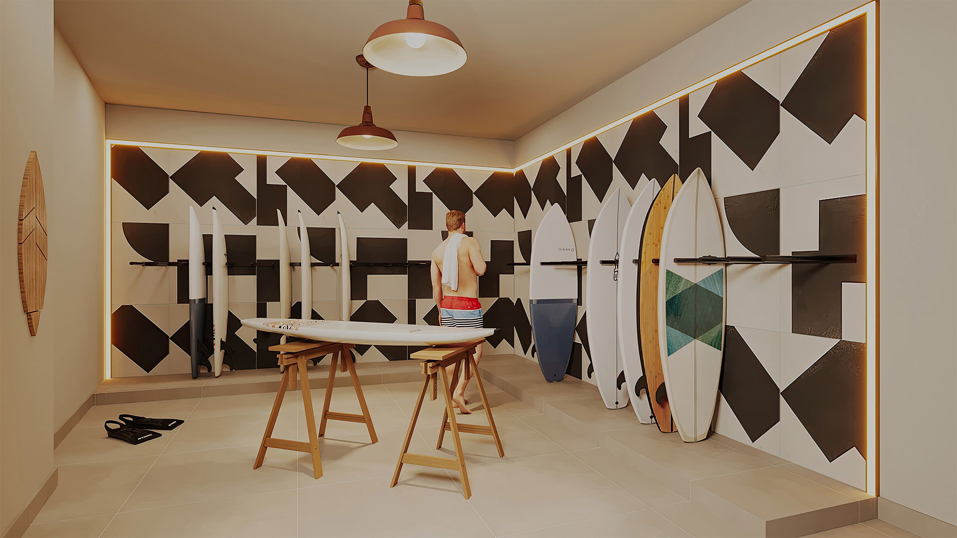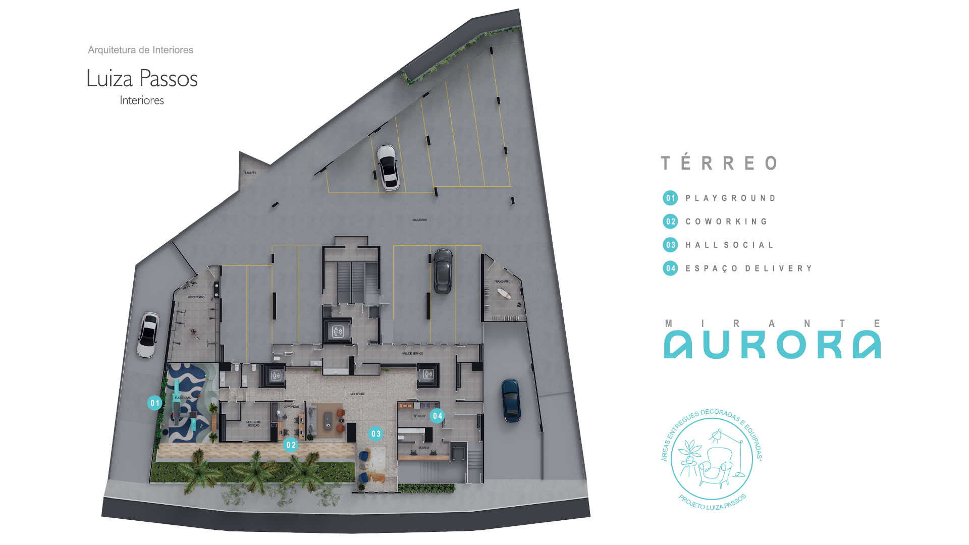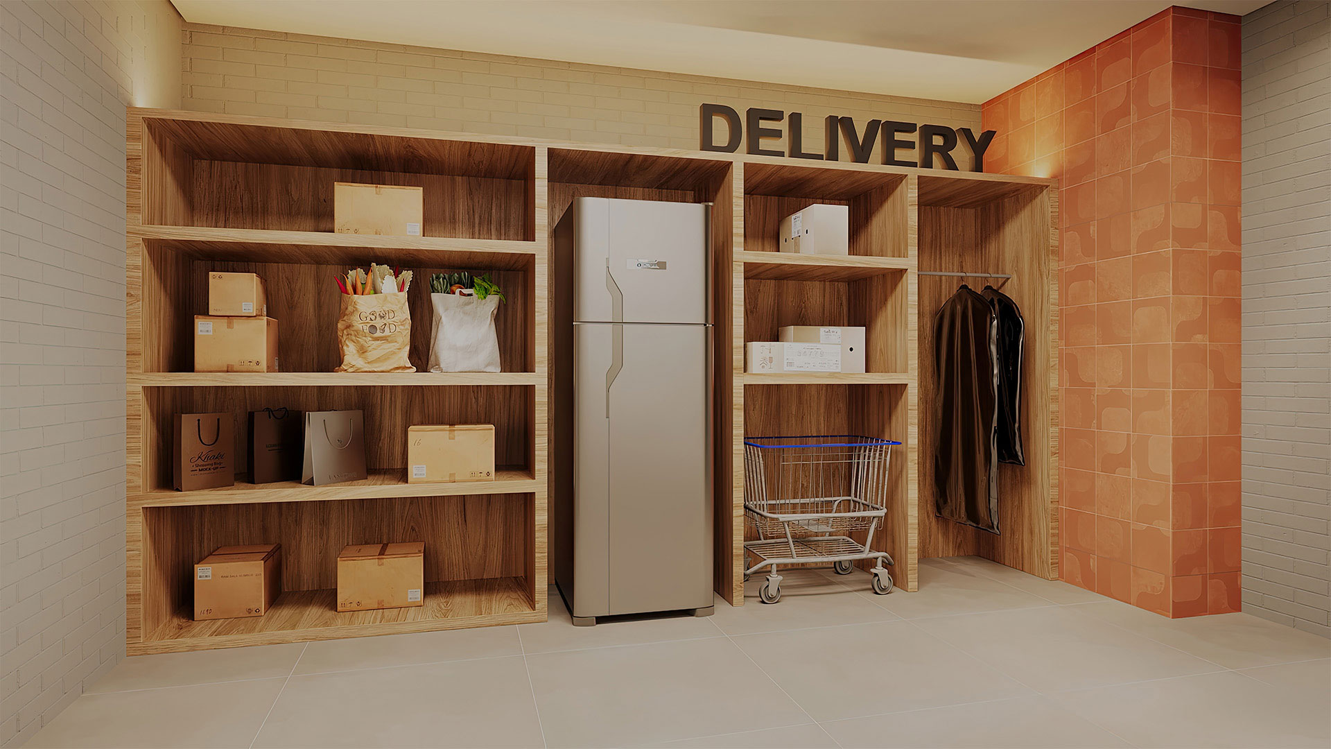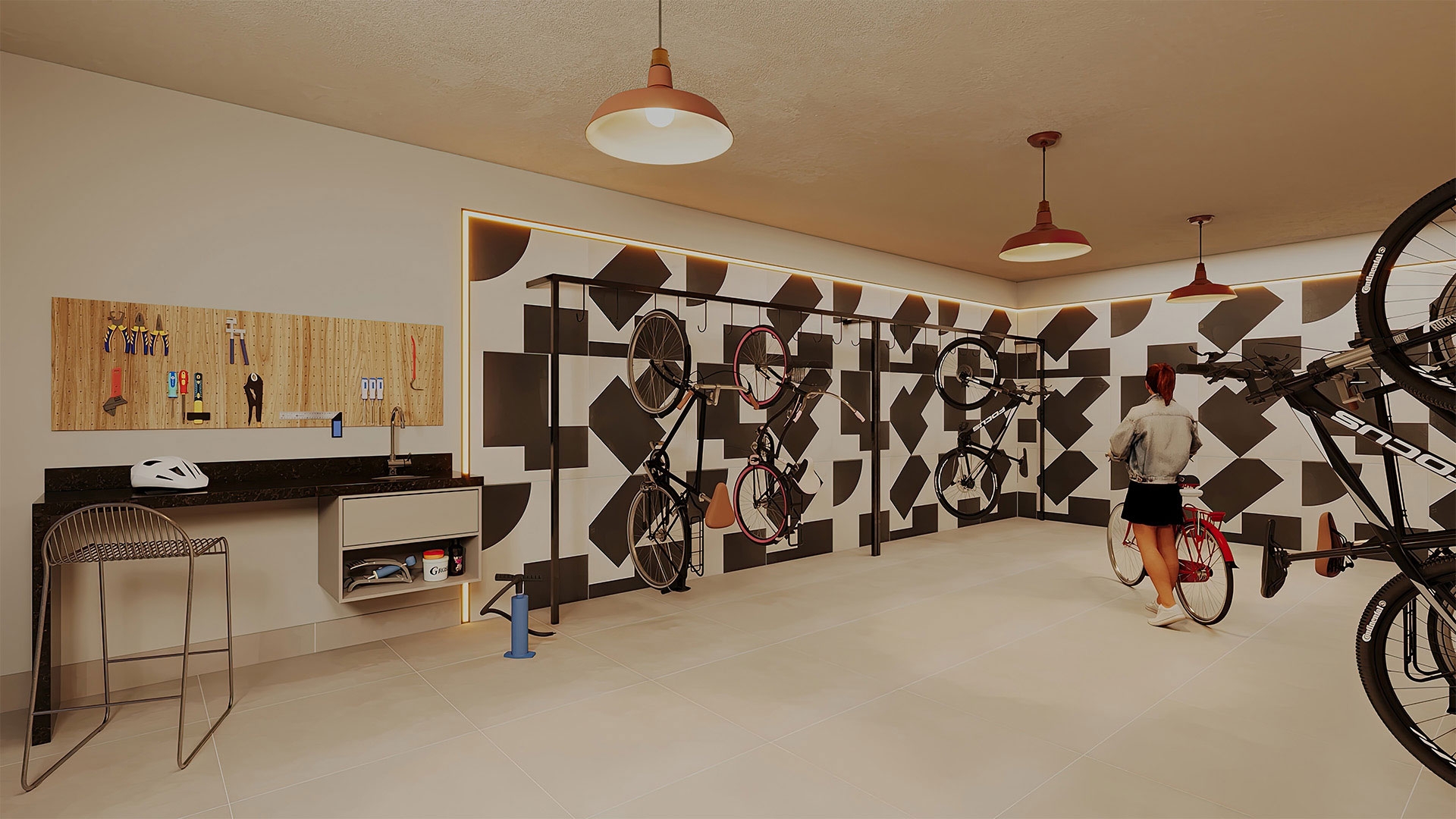 Playground, pranchário, bicicletário, coworking, depósito e área de delivery.