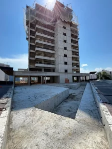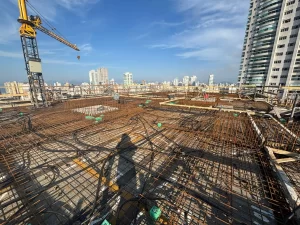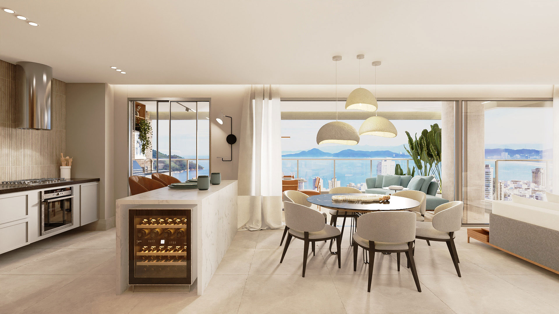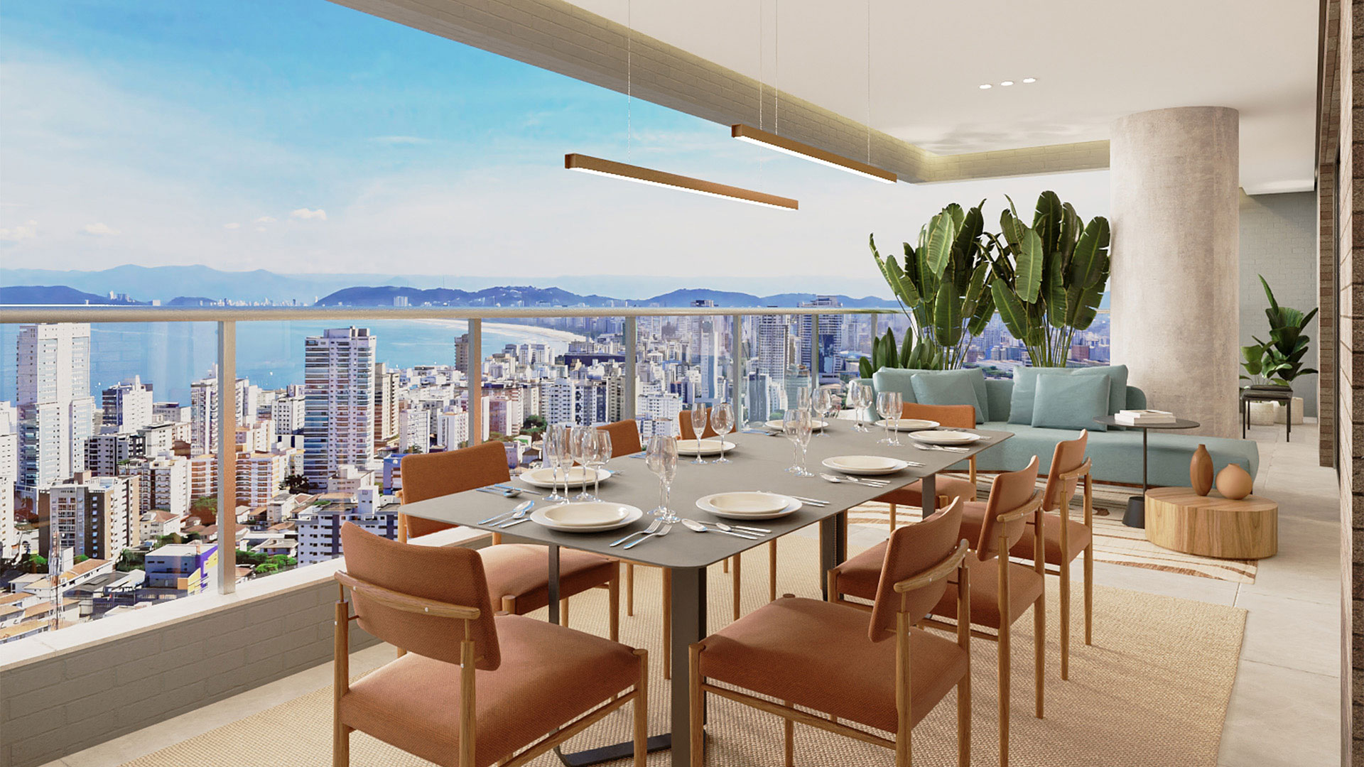 3 suítes, ampla sala com lavabo e terraço gourmet, cozinha integrada, vestíbulo, área de serviço, W.C. e terraço técnico. Elevador social privativo. Todos os apartamentos de frente, com vista para o mar nos andares mais altos.