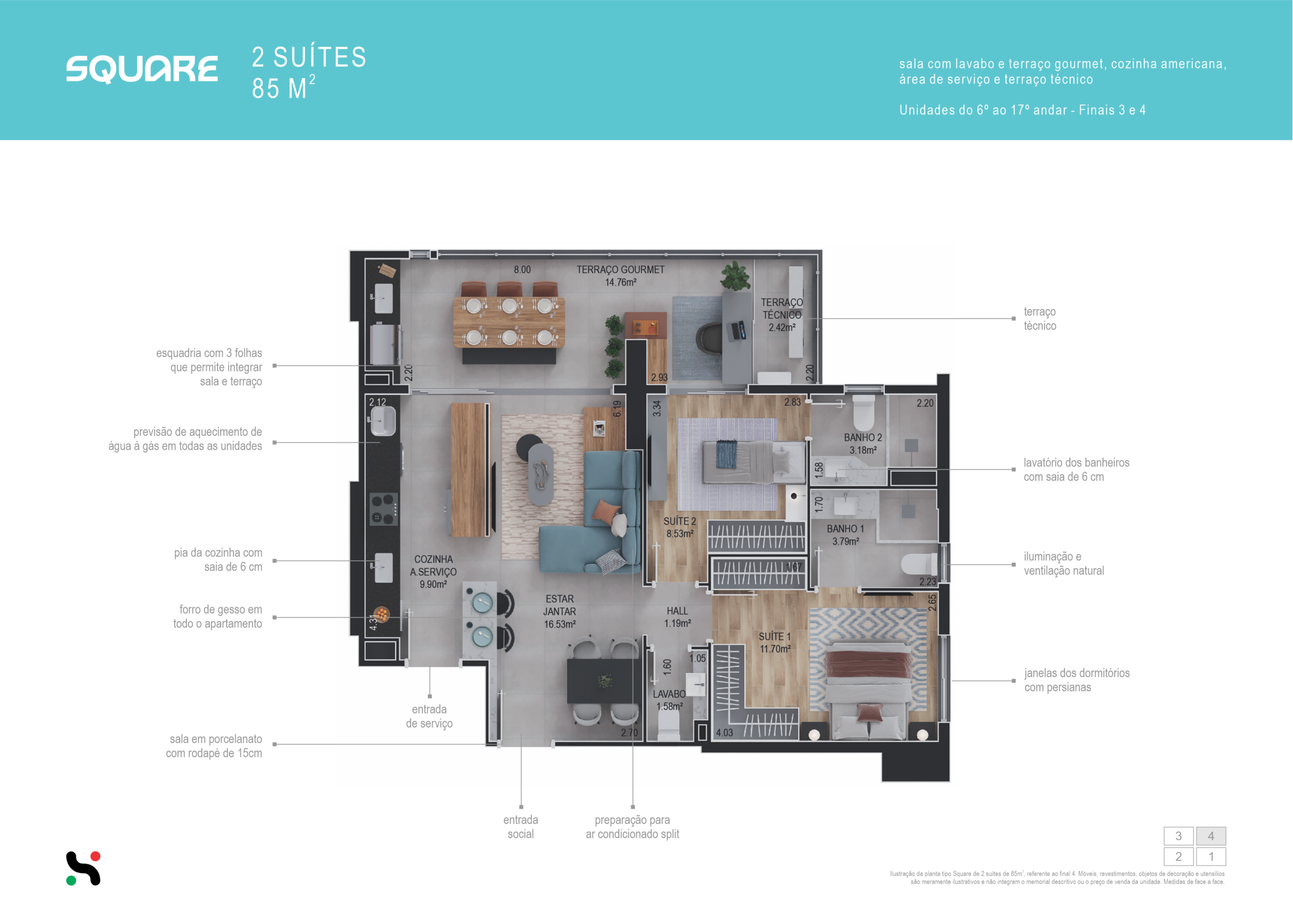 6° ao 17° andar – Final 3 e 4 – 24 unidades – 85 m²